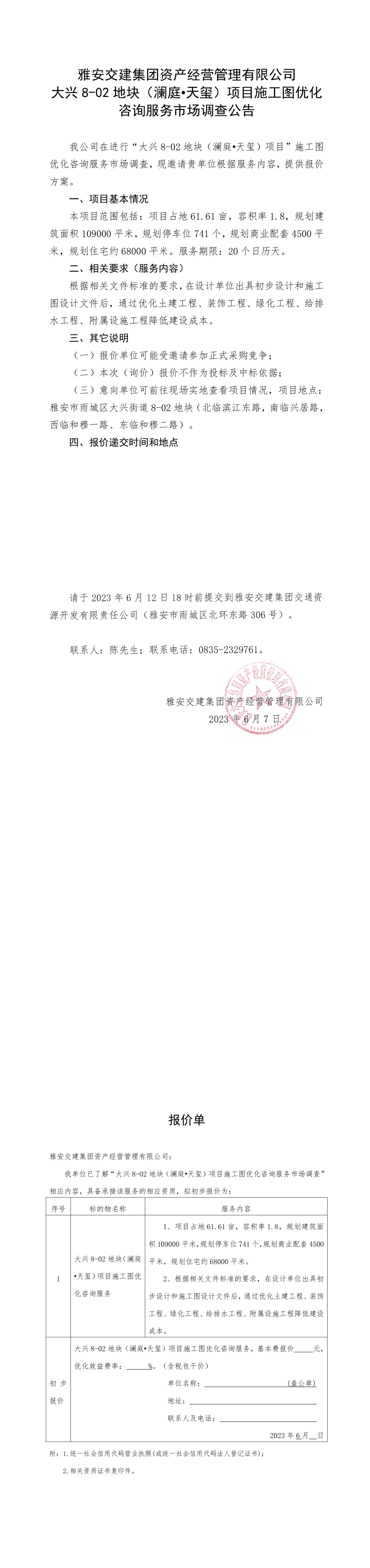 雅安交建集團(tuán)資產(chǎn)經(jīng)營管理有限公司大興8-02地塊(瀾庭·天璽)項目施工圖優(yōu)化咨詢服務(wù)市場調(diào)查公告