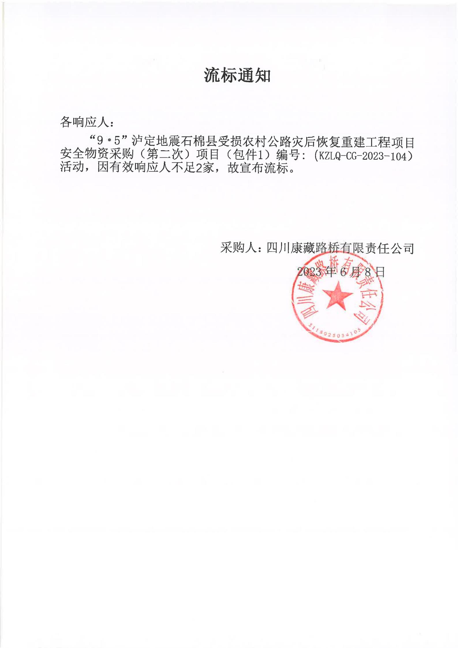 四川康藏路橋有限責任公司“9·5”瀘定地震石棉縣受損農(nóng)村公路災后恢復重建工程項目安全物資競價采購(第二次)流標通知