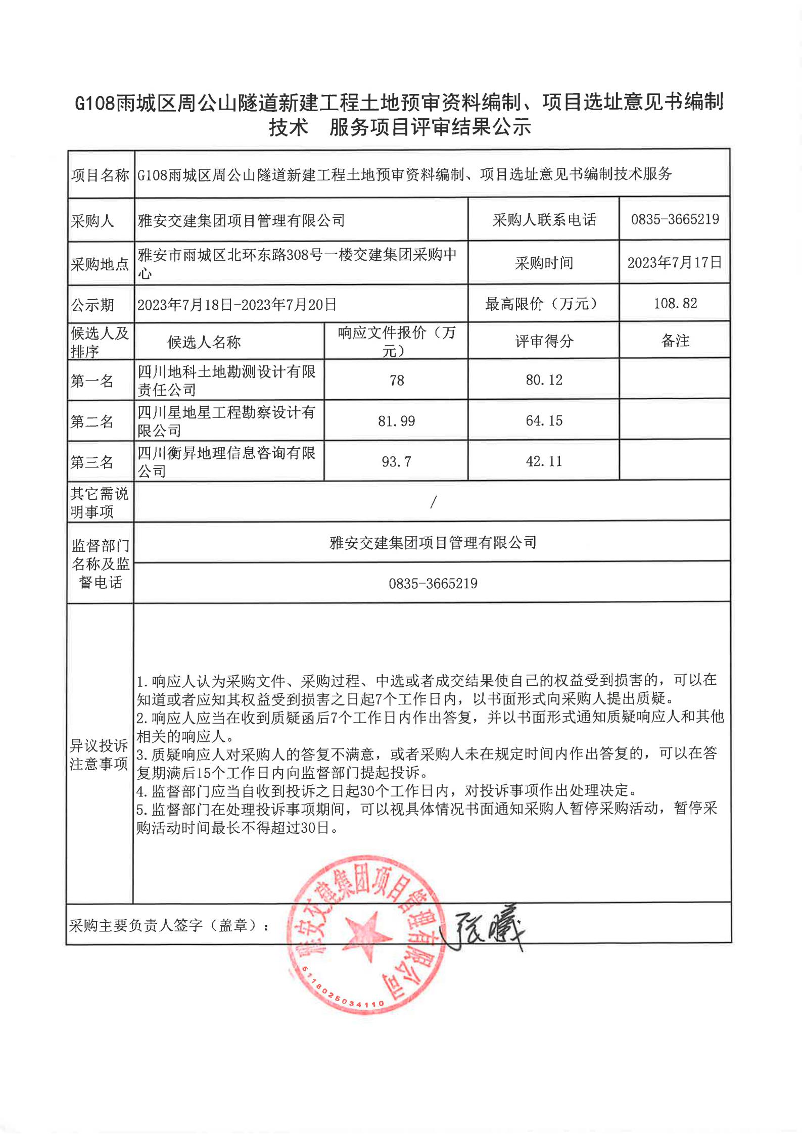 雅安交建集團項目管理有限公司G108雨城區(qū)周公山隧道新建工程土地預(yù)審資料編制、項目選址意見書編制技術(shù)服務(wù)項目評審結(jié)果公示