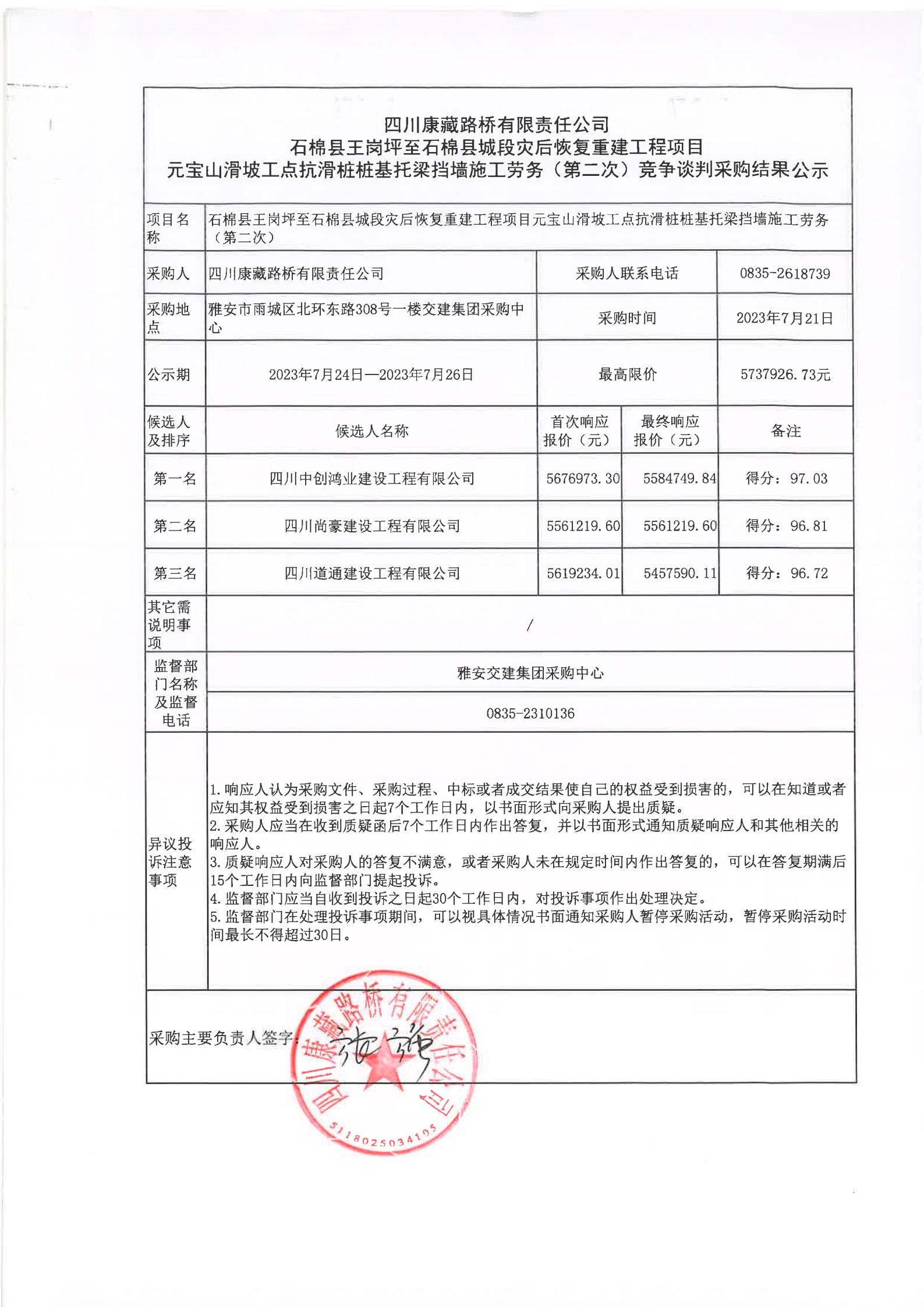 四川康藏路橋有限責(zé)任公司石棉縣王崗坪至石棉縣城段災(zāi)后恢復(fù)重建工程項目元寶山滑坡工點抗滑樁樁基托梁擋墻施工勞務(wù)(第二次)競爭談判采購結(jié)果公示
