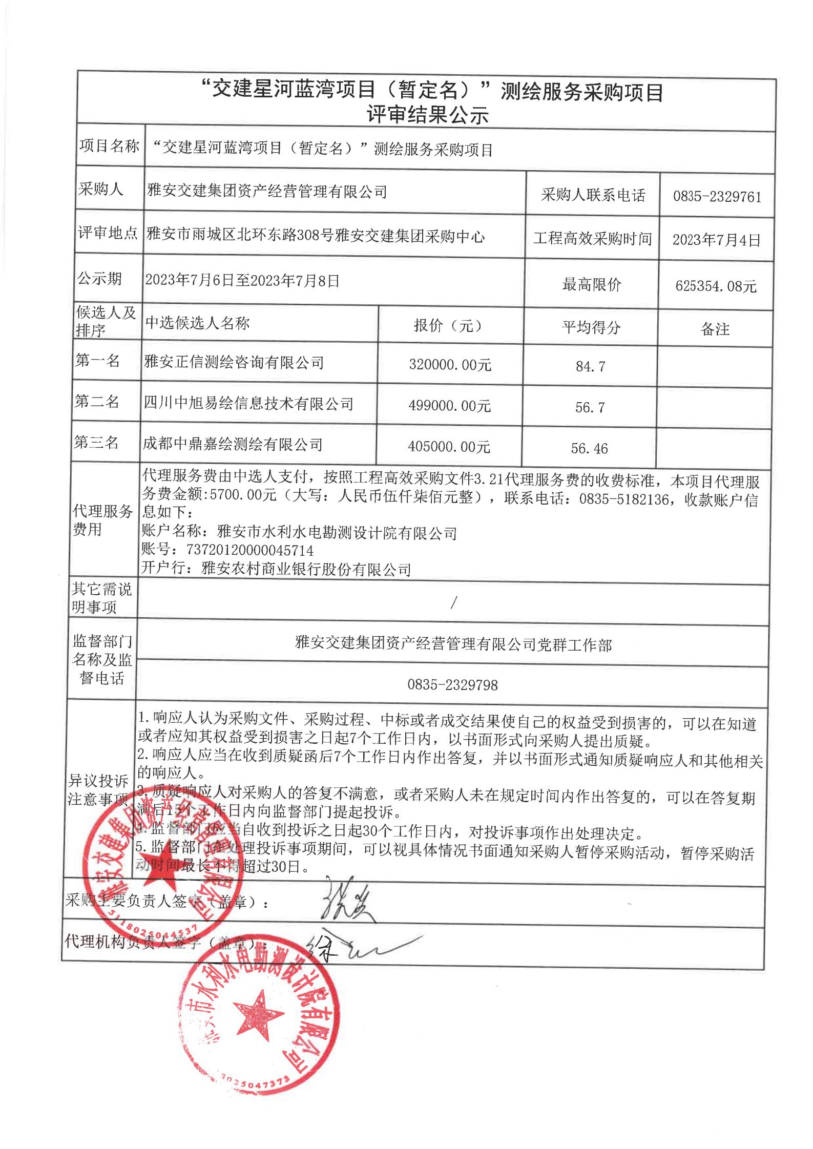 雅安交建集團資產(chǎn)經(jīng)營管理有限公司“交建星河藍灣項目(暫定名)”測繪服務采購項目評審結(jié)果公示
