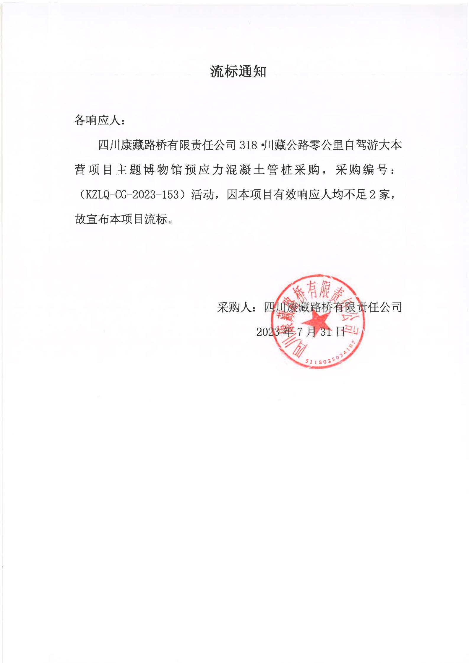 四川康藏路橋有限責(zé)任公司318·川藏公路零公里自駕游大本營項目主題博物館預(yù)應(yīng)力混凝土管樁采購流標通知