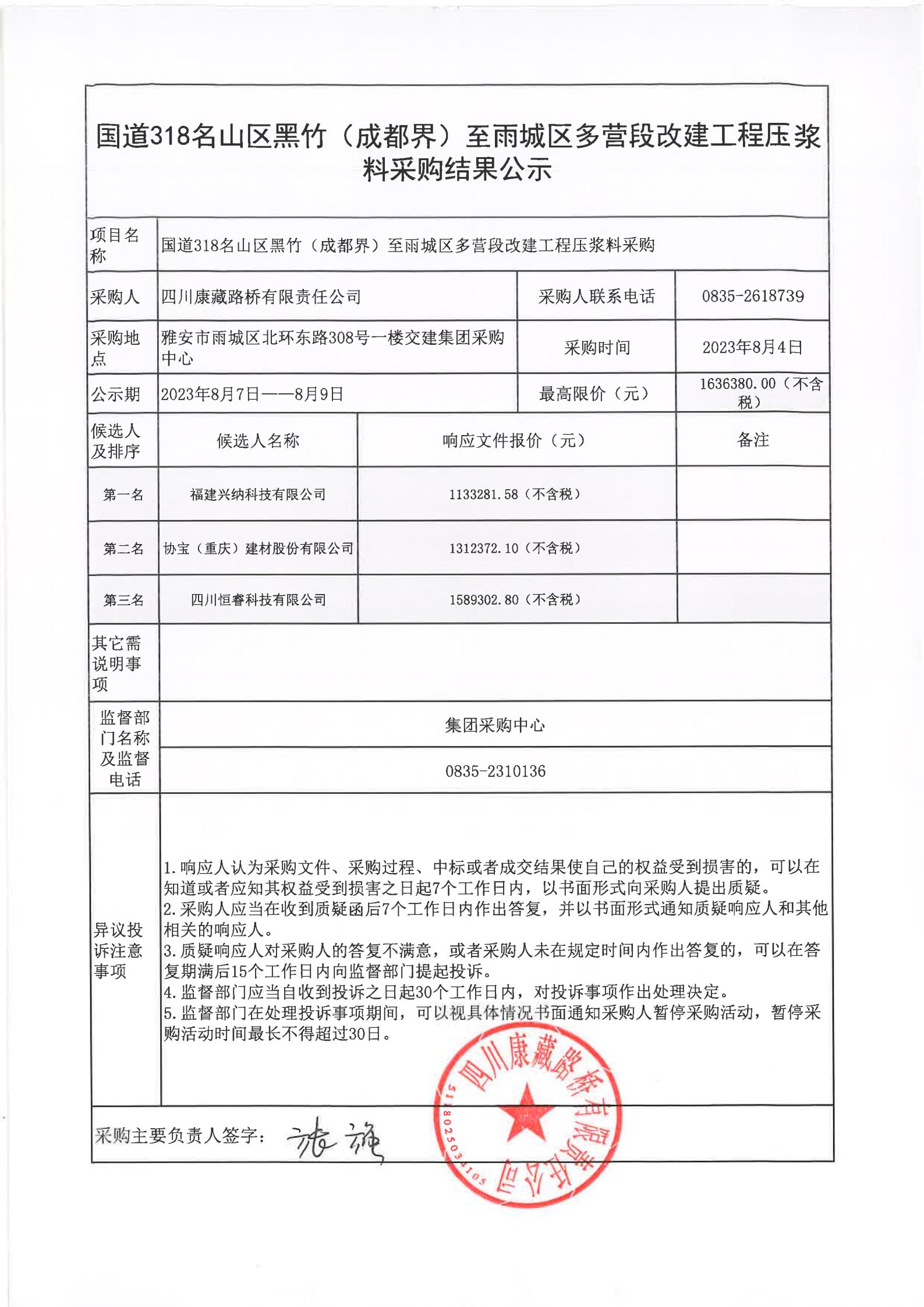四川康藏路橋有限責(zé)任公司國(guó)道318名山區(qū)黑竹(成都界)至雨城區(qū)多營(yíng)段改建工程壓漿料采購(gòu)結(jié)果公示