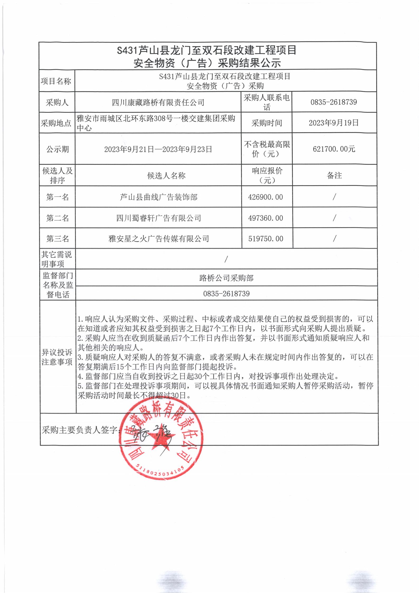 四川康藏路橋有限責(zé)任公司S431蘆山縣龍門(mén)至雙石段改建工程項(xiàng)目安全物資(廣告)采購(gòu)結(jié)果公示