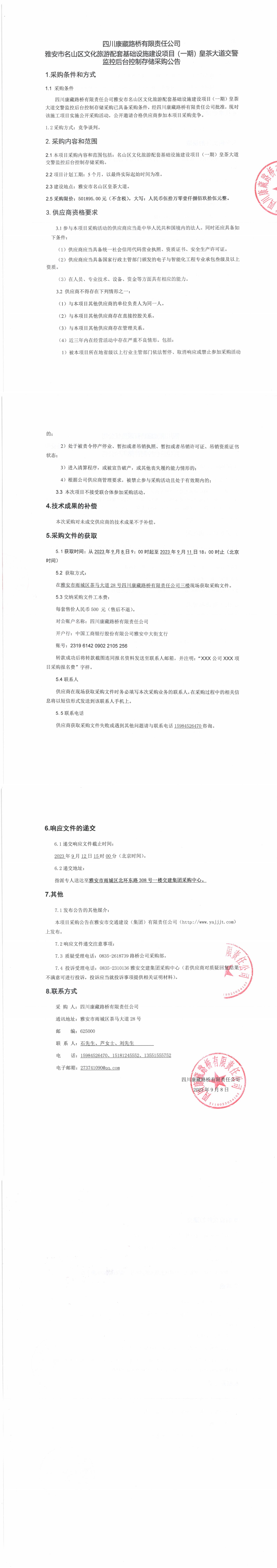 四川康藏路橋有限責(zé)任公司雅安市名山區(qū)文化旅游配套基礎(chǔ)設(shè)施建設(shè)項(xiàng)目(一期)皇茶大道交警監(jiān)控后臺控制存儲采購公告