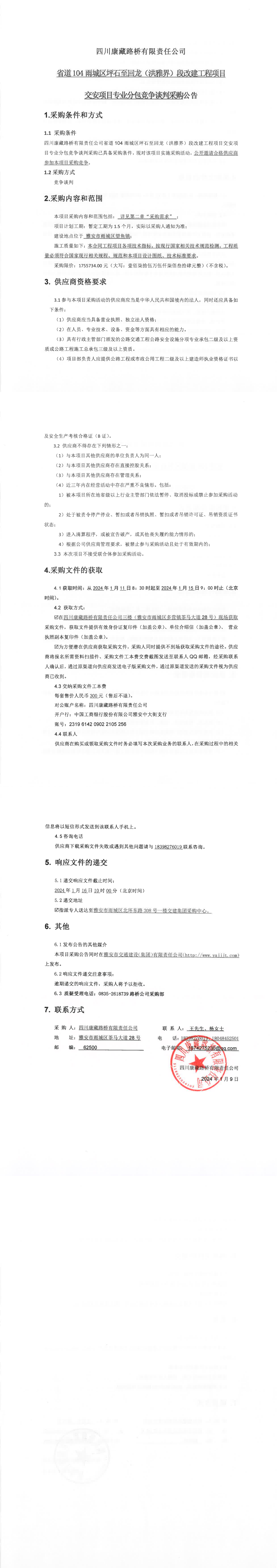 四川康藏路橋有限責(zé)任公司省道104雨城區(qū)坪石至回龍(洪雅界)段改建工程項(xiàng)目交安項(xiàng)目專業(yè)分包競(jìng)爭談判采購公告