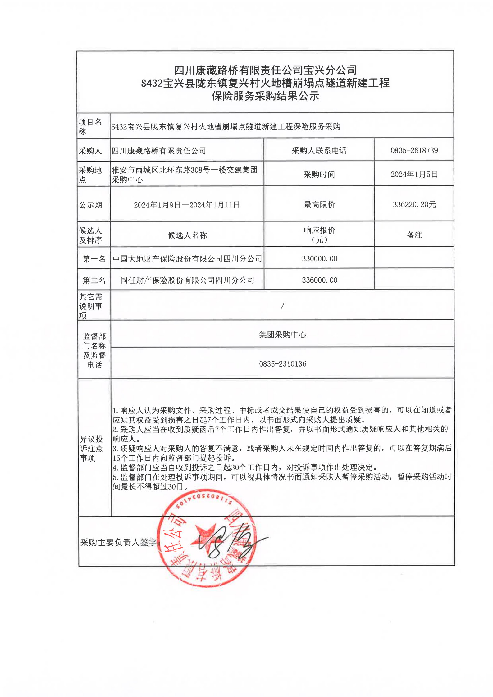 四川康藏路橋有限責任公司S432寶興縣隴東鎮(zhèn)復(fù)興村火地槽崩塌點隧道新建工程保險服務(wù)采購結(jié)果公示