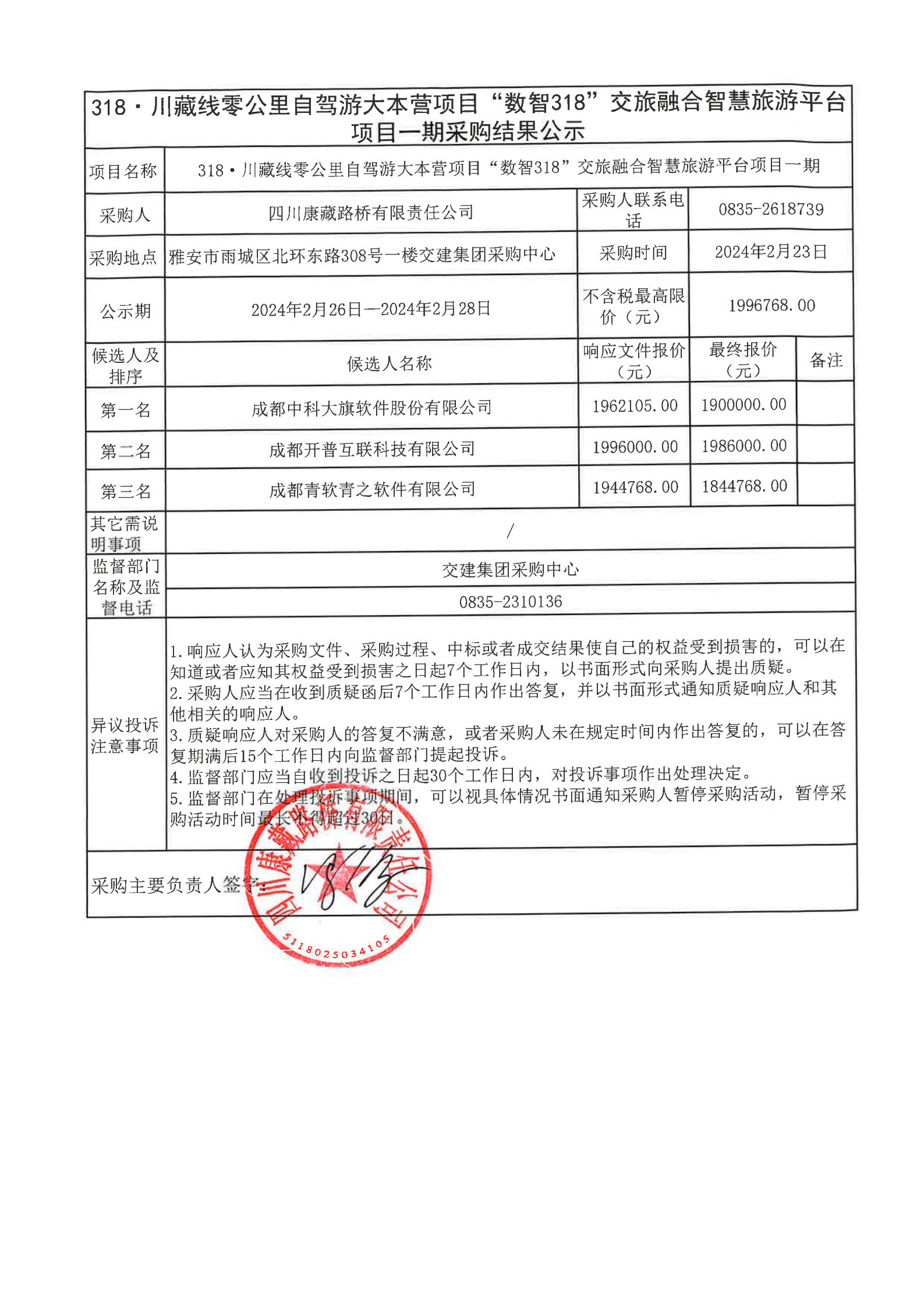 四川康藏路橋有限責任公司318·川藏公路零公里自駕游大本營項目“數(shù)智318”交旅融合智慧旅游平臺項目一期采購結果公示