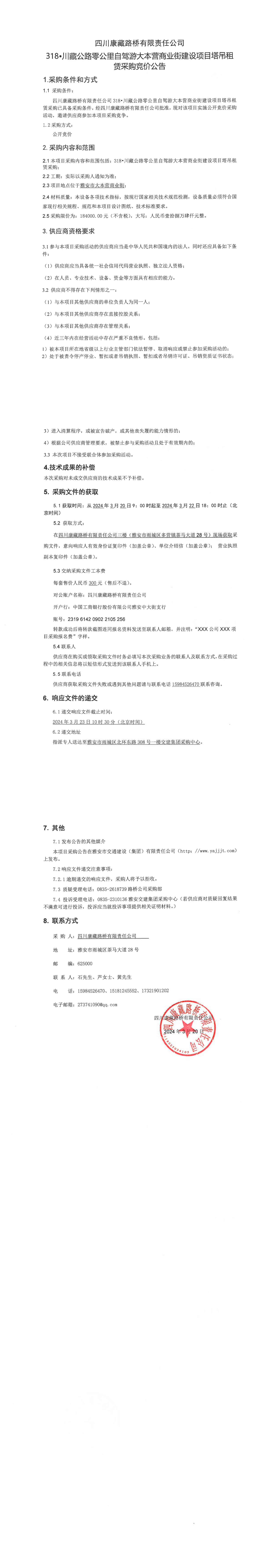 四川康藏路橋有限責(zé)任公司318·川藏公路零公里自駕游大本營商業(yè)街建設(shè)項目塔吊租賃采購競價公告