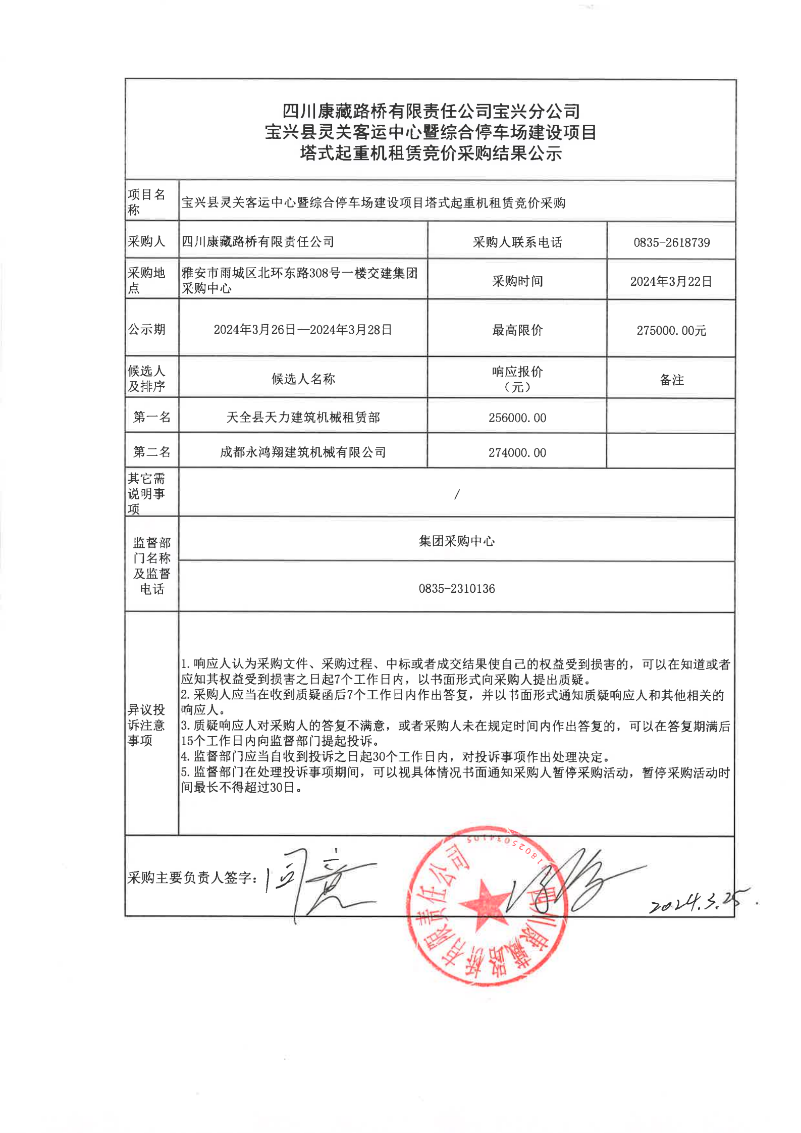 四川康藏路橋有限責任公司寶興縣靈關客運中心暨綜合停車場建設項目塔式起重機租賃競價采購結果公示