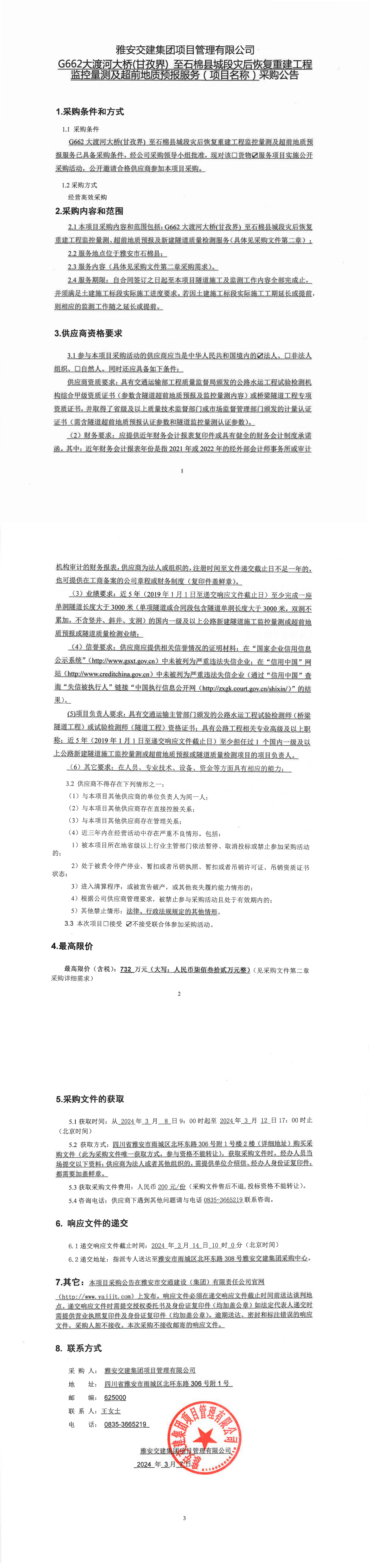 雅安交建集團項目管理有限公司G662大渡河大橋(甘孜界)至石棉縣城段災(zāi)后恢復重建工程監(jiān)控量測及超前地質(zhì)預報服務(wù)(項目名稱)采購公告