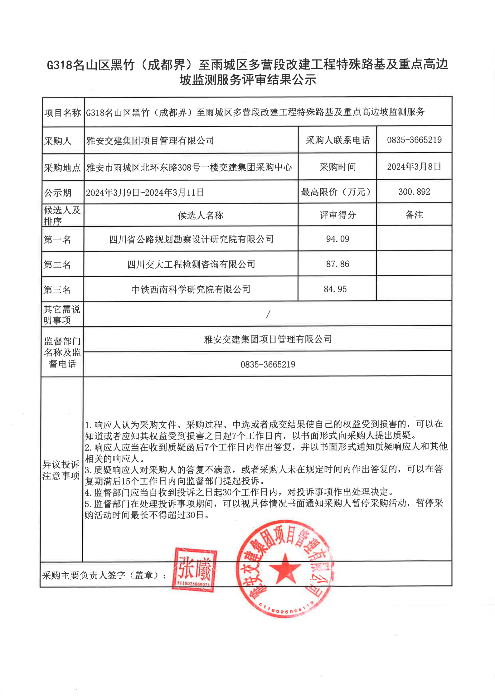 雅安交建集團(tuán)項(xiàng)目管理有限公司G318名山區(qū)黑竹(成度界)至雨城區(qū)多營(yíng)段改建工程特殊路基及重點(diǎn)高邊坡監(jiān)測(cè)服務(wù)評(píng)審結(jié)果公示
