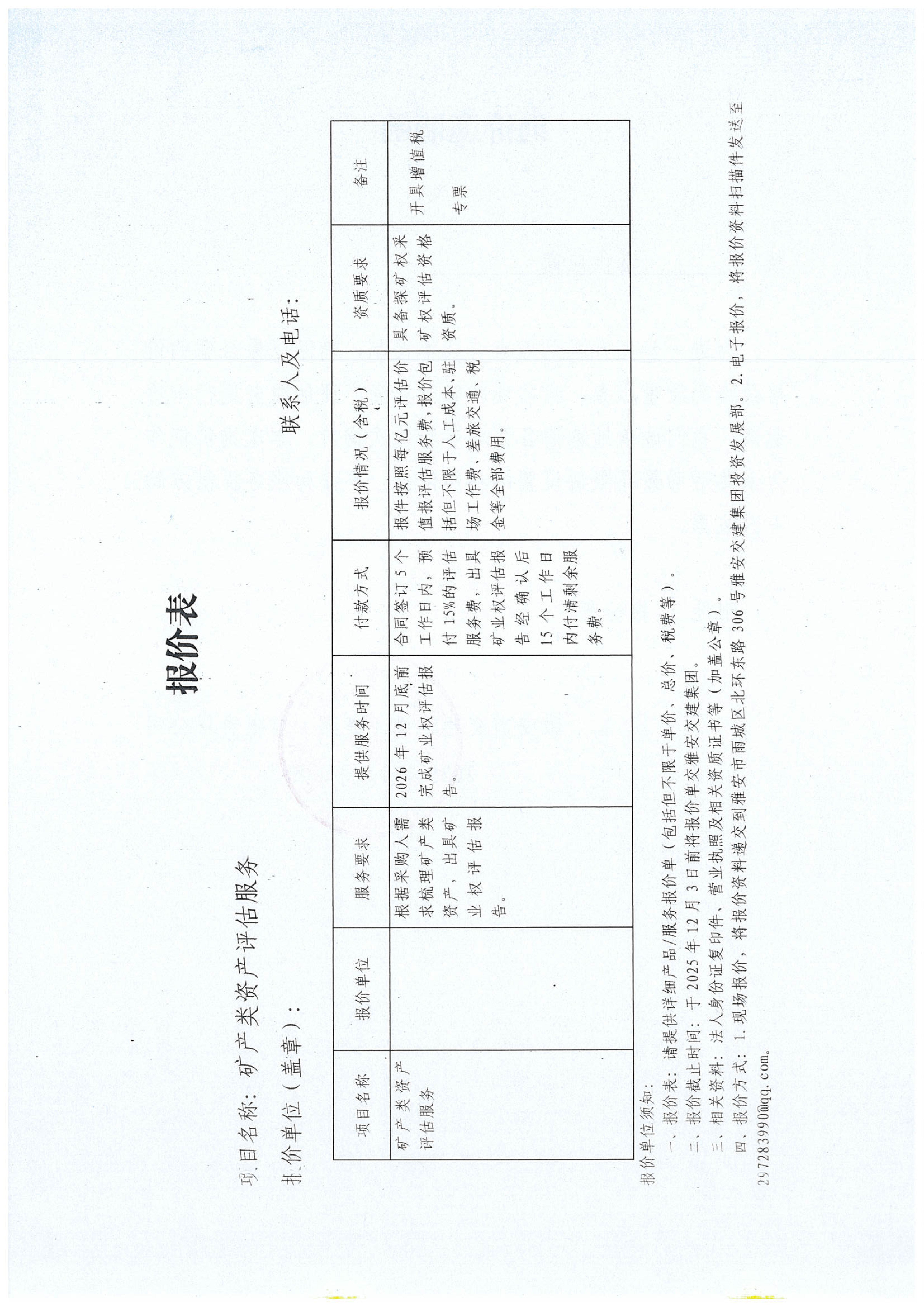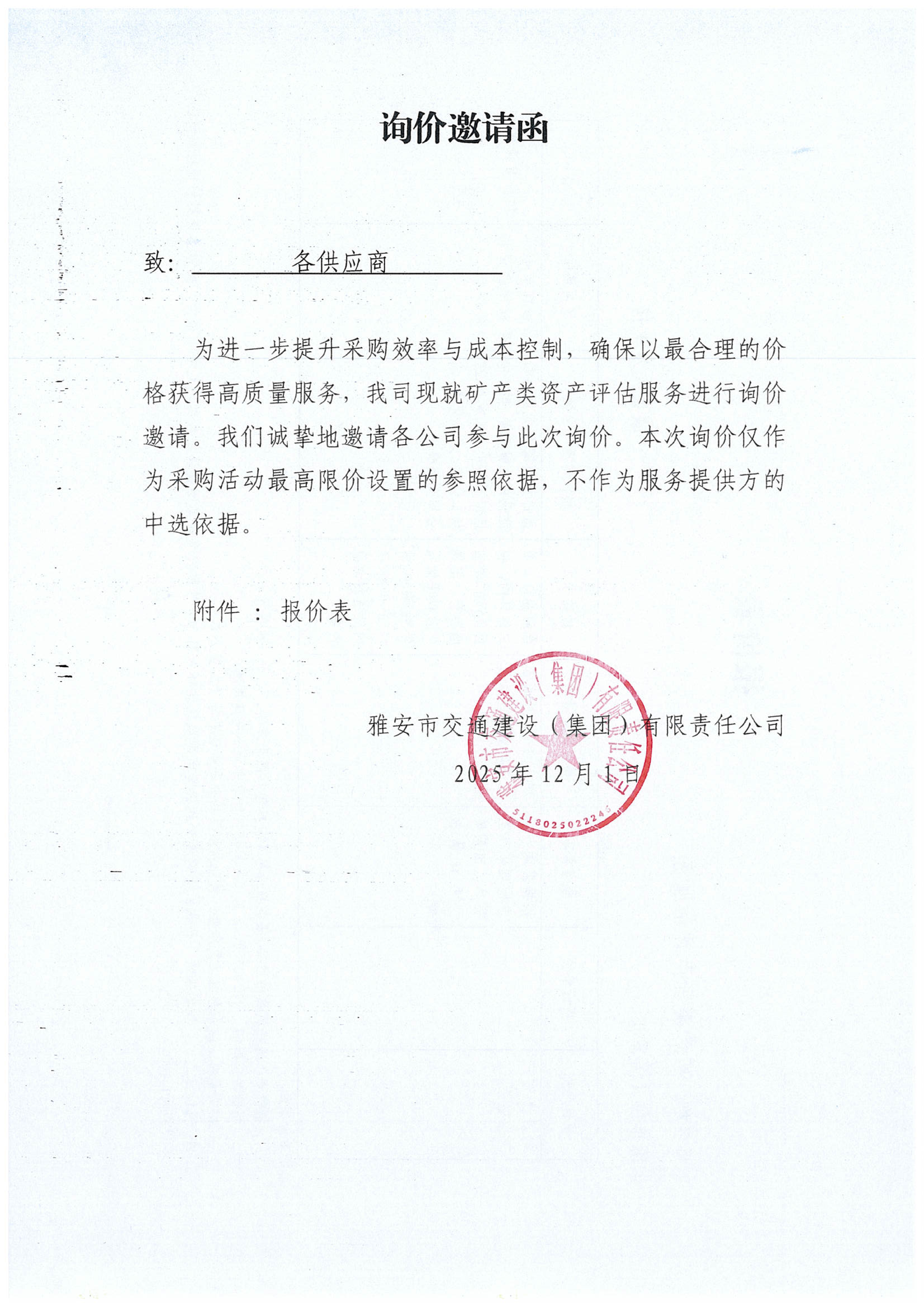 關(guān)于雅安市交通建設(shè)(集團)有限責任公司礦產(chǎn)類資產(chǎn)評估服務(wù)采購限價的詢價函