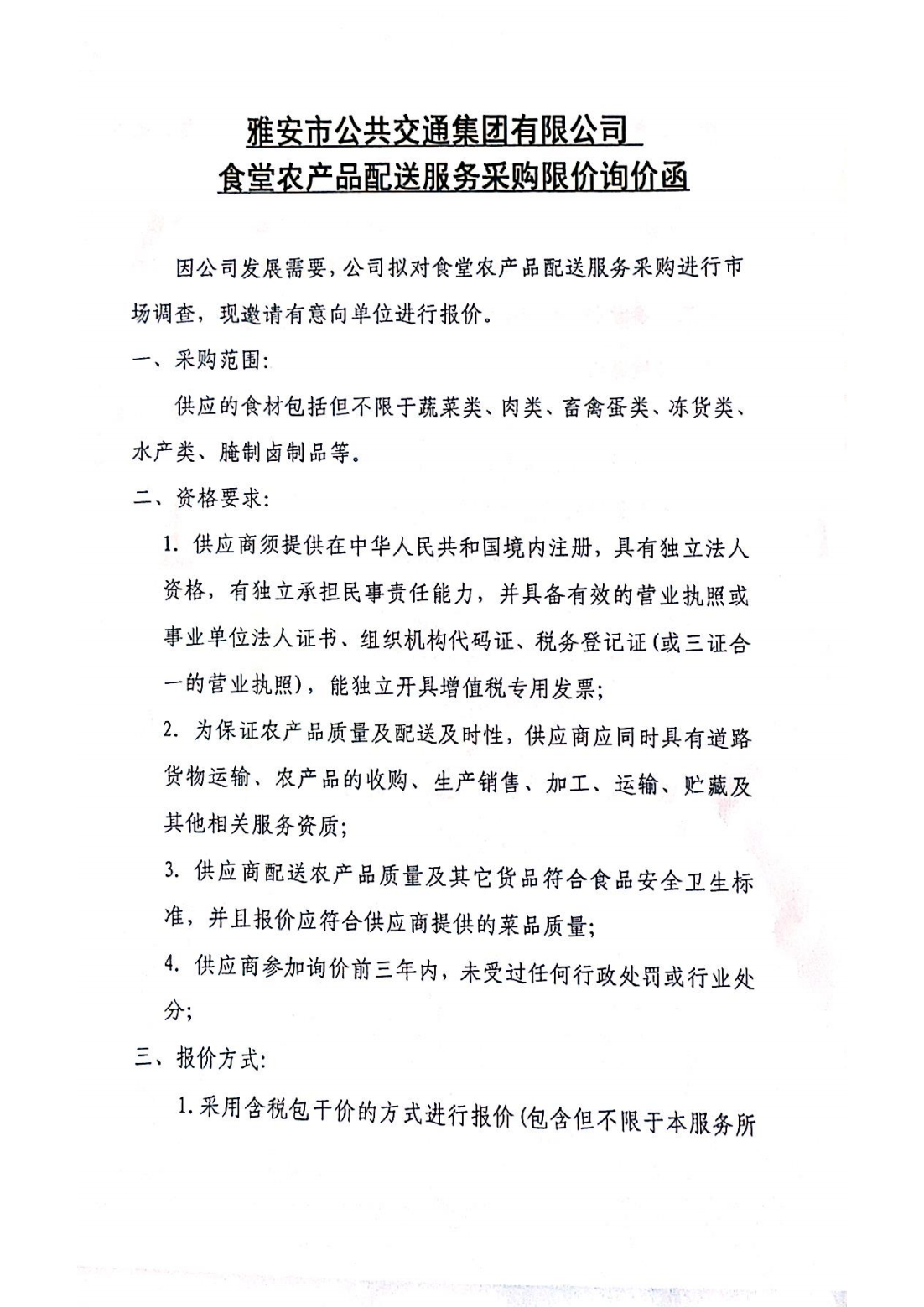 關(guān)于雅安市公共交通集團有限公司食堂農(nóng)產(chǎn)品配送服務采購限價的詢價函