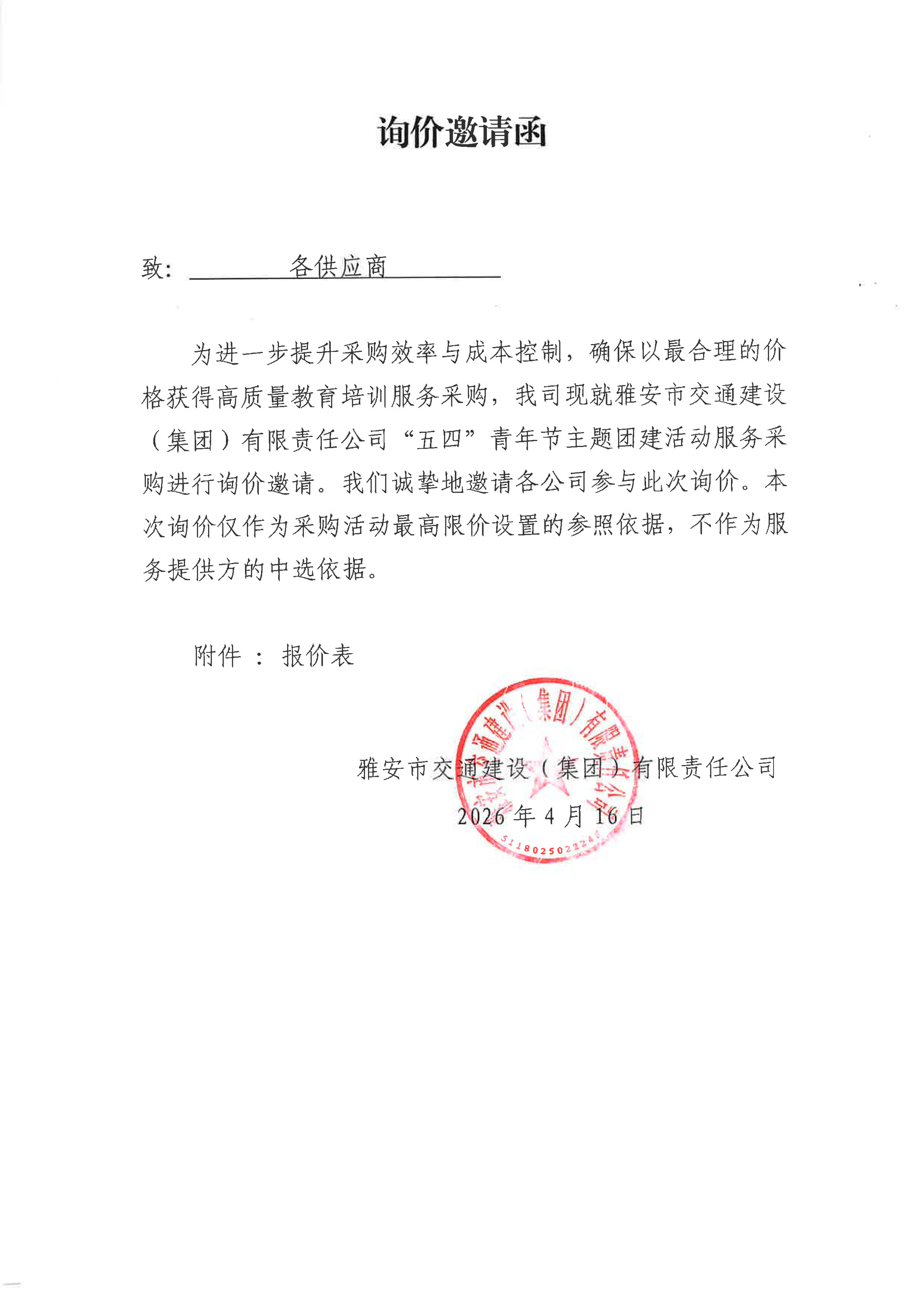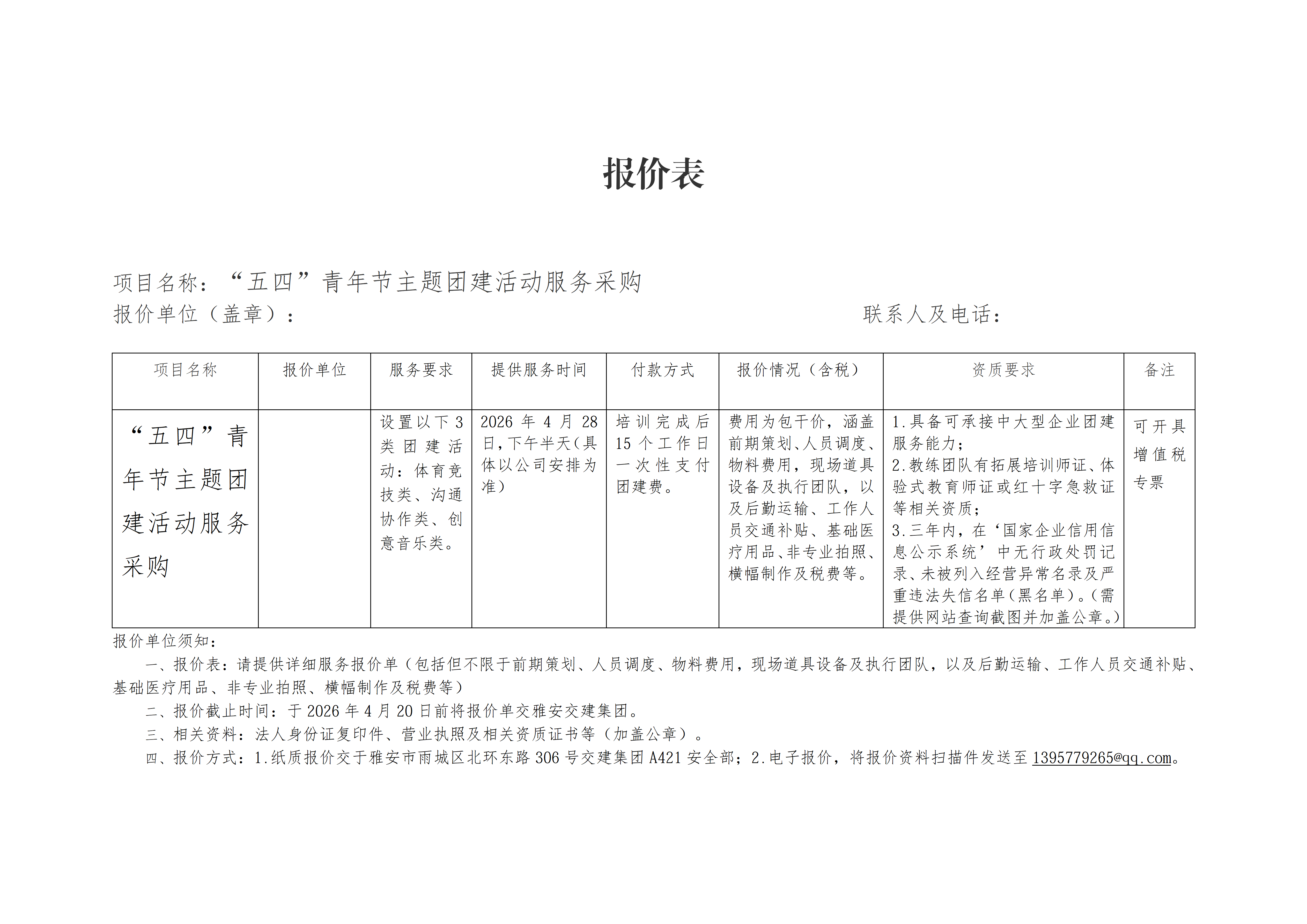 關(guān)于“五四”青年節(jié)主題團(tuán)建活動服務(wù)采購限價的詢價函