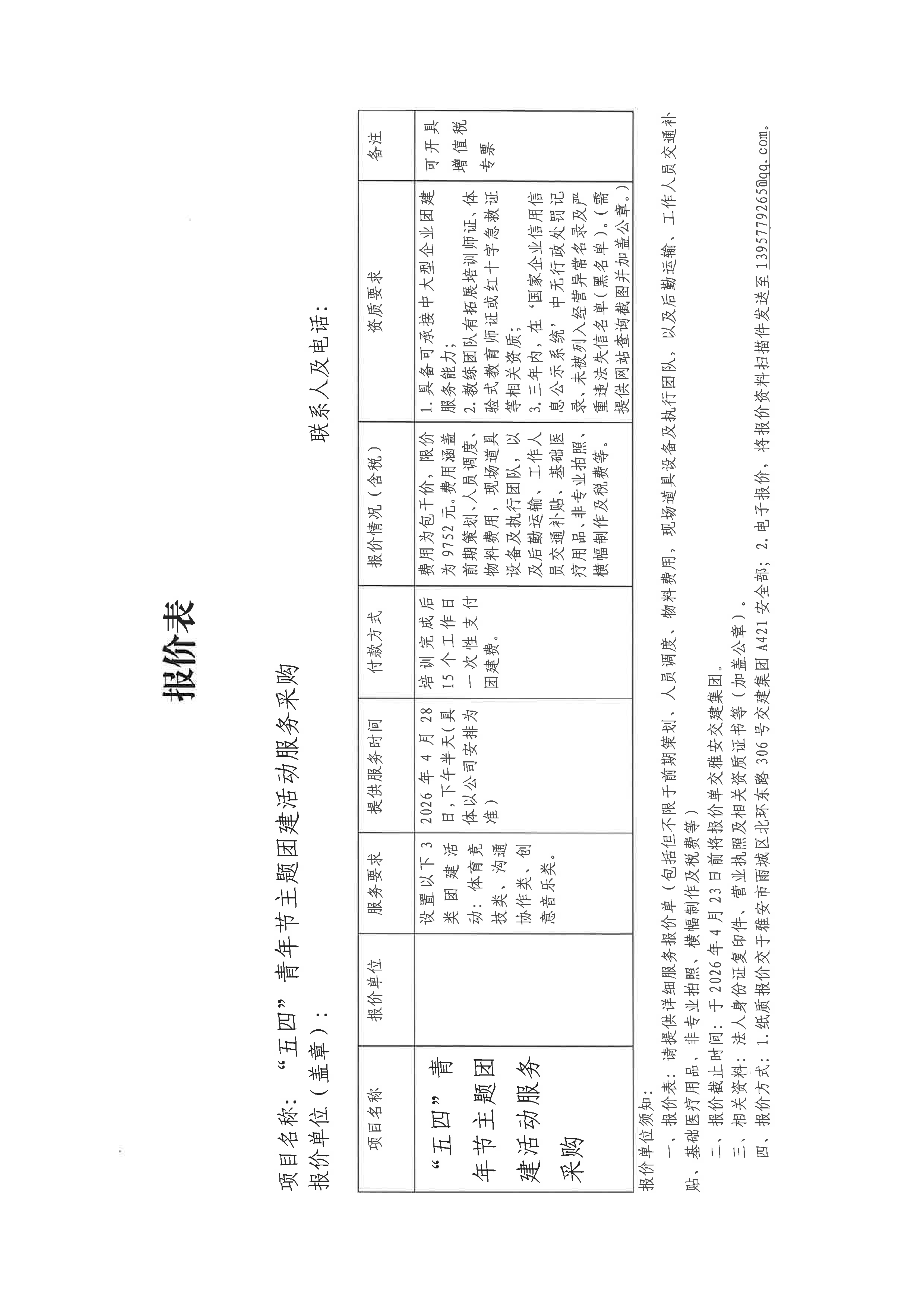 關(guān)于“五四”青年節(jié)主題團建活動服務采購限價的詢價函