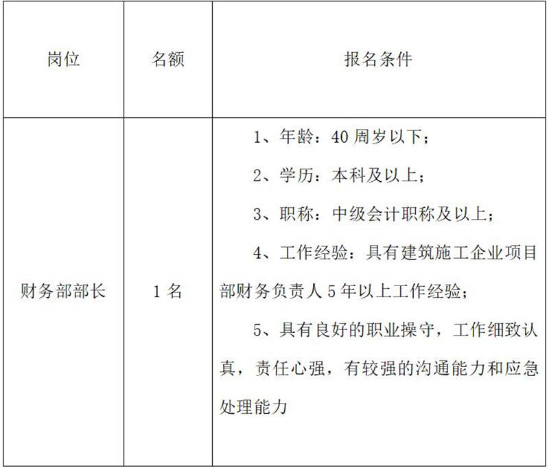 雅安交建集團(tuán)路橋有限責(zé)任公司是雅安市交通建設(shè)(集團(tuán))有限責(zé)任公司下屬子公司,主要從事道路、橋梁修建。現(xiàn)根據(jù)公司業(yè)務(wù)發(fā)展需要,擬向社會(huì)公開(kāi)招聘1名財(cái)務(wù)部部長(zhǎng),現(xiàn)將有關(guān)事項(xiàng)公告如下: