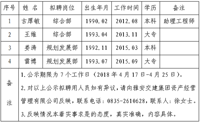 通過(guò)公開(kāi)報(bào)名、資格審查、面試等程序,經(jīng)雅安交建集團(tuán)資產(chǎn)經(jīng)營(yíng)管理有限公司研究擇優(yōu)確定以下4名擬聘用人員,現(xiàn)公示名單如下: