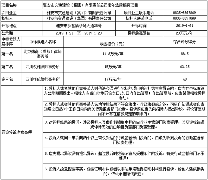 雅安市交通建設(shè)(集團(tuán))有限責(zé)任公司常年法律服務(wù)項(xiàng)目公示