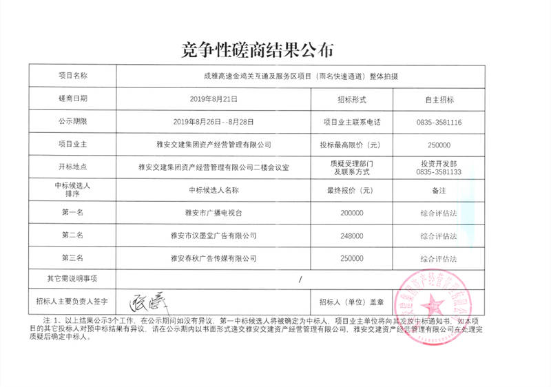 成雅高速金雞關(guān)互通及服務(wù)區(qū)項(xiàng)目(雨名快速通道)整體拍攝競(jìng)爭(zhēng)性磋商結(jié)果公布