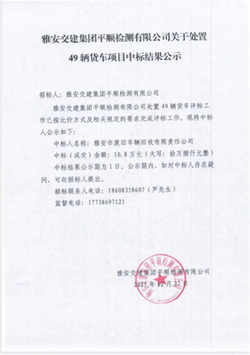 雅安交建集團平順檢測公司關(guān)于處置49輛貨車項目中標(biāo)結(jié)果公示
