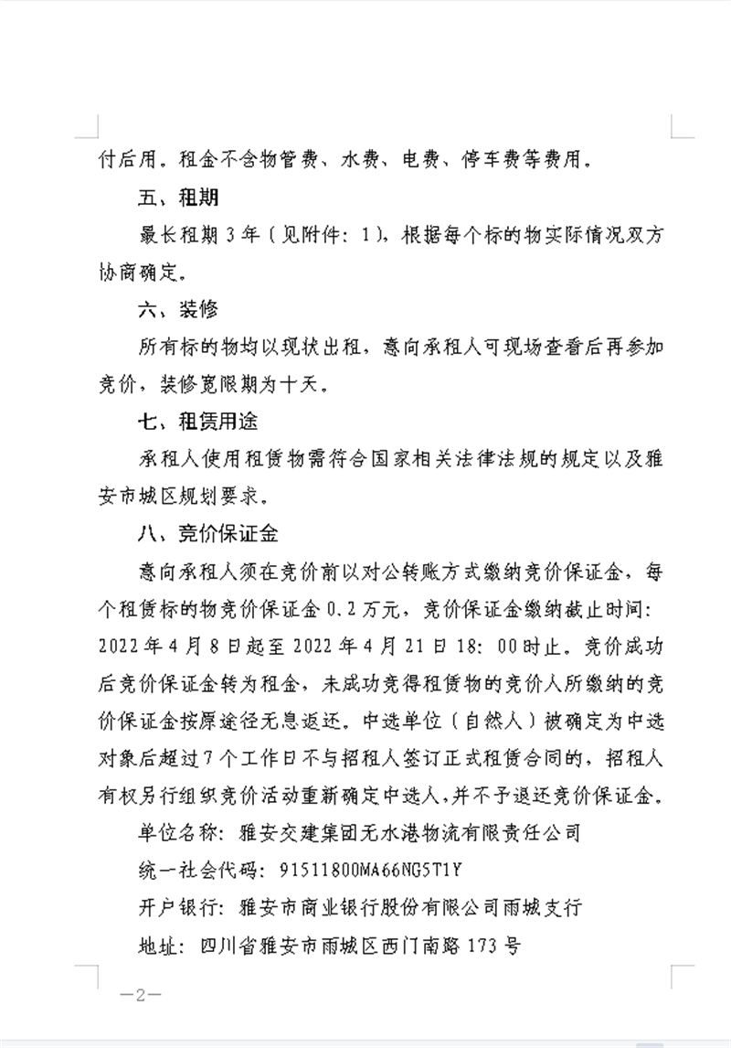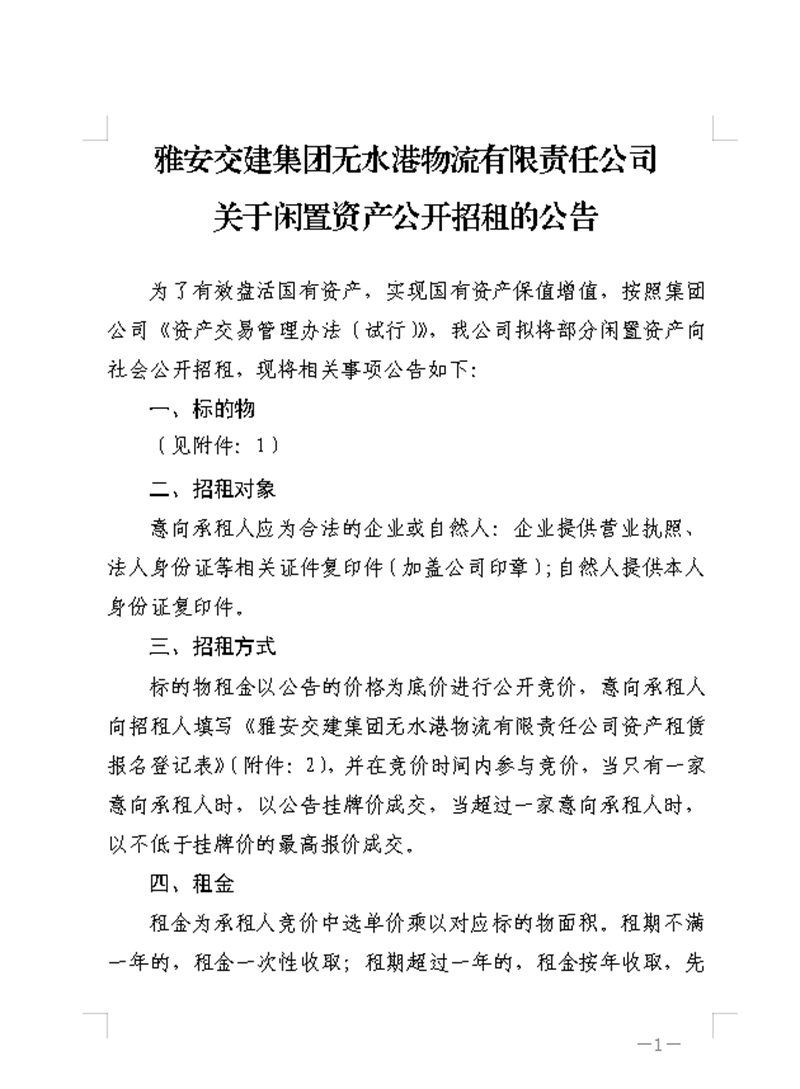 雅安交建集團無水港物流有限責任公司關于資產掛網招租的公告