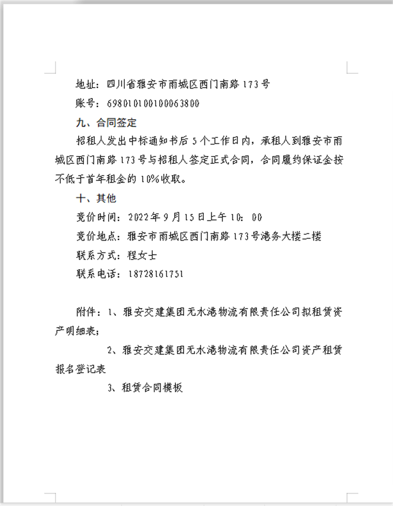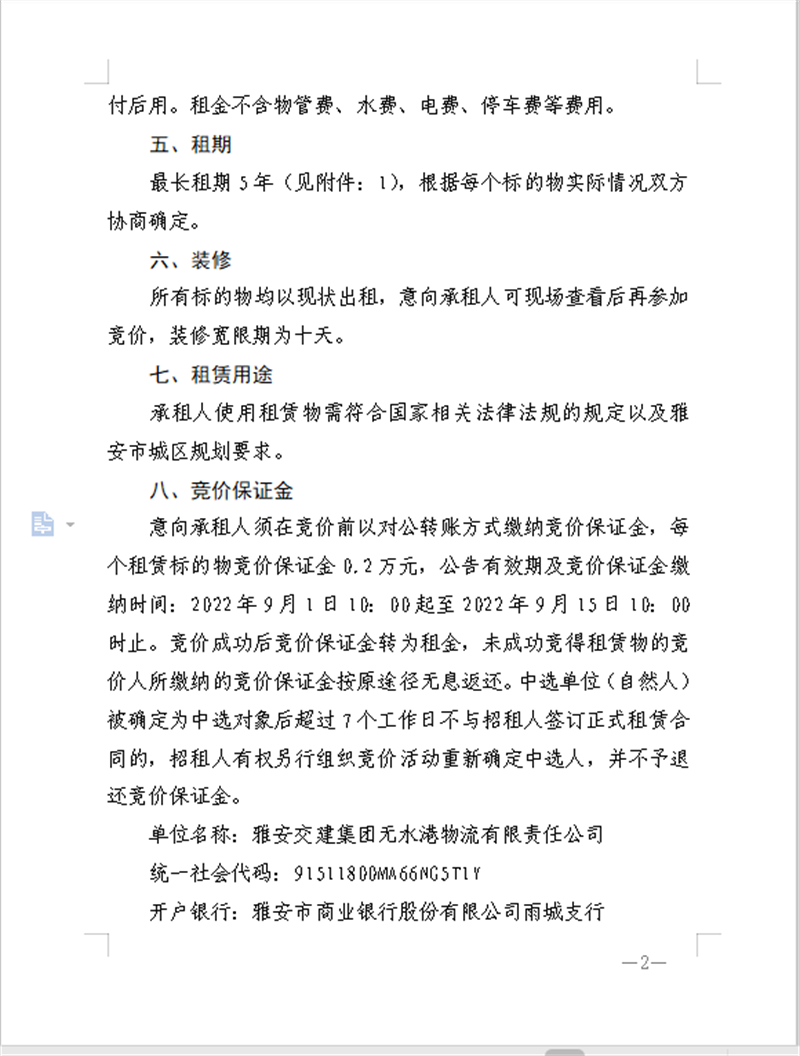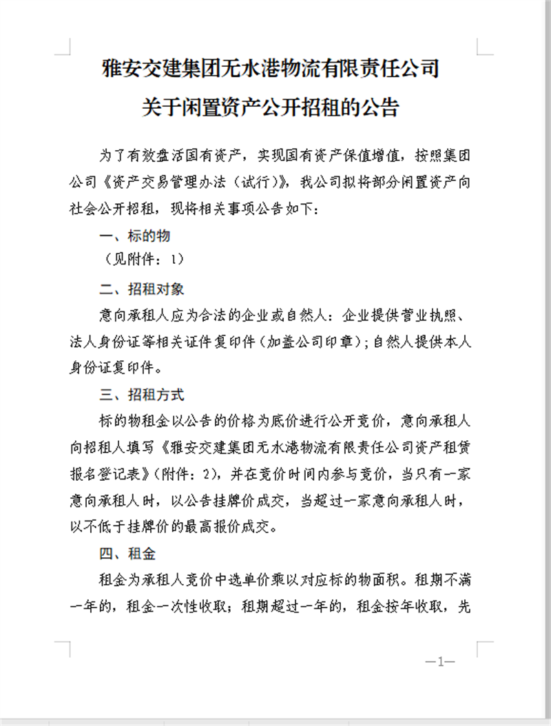 雅安交建無水港公司關(guān)于閑置資產(chǎn)公開招租的公告
