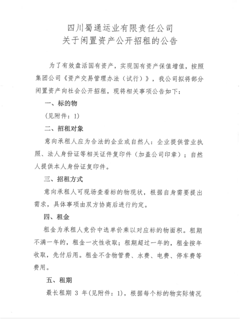 蜀通運業(yè)有限責任公司關于閑置資產公開招租的公告附件