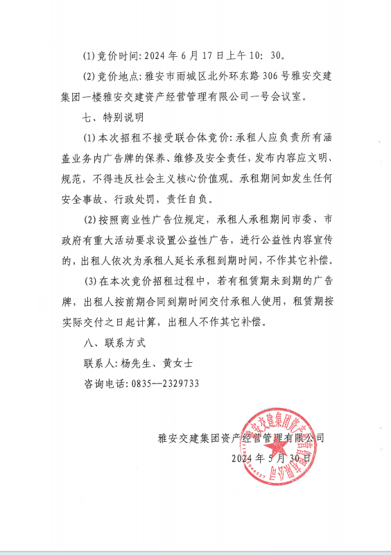雅安交建集團(tuán)資產(chǎn)經(jīng)營管理有限公司關(guān)于戶外廣告位競(jìng)價(jià)招租的公告