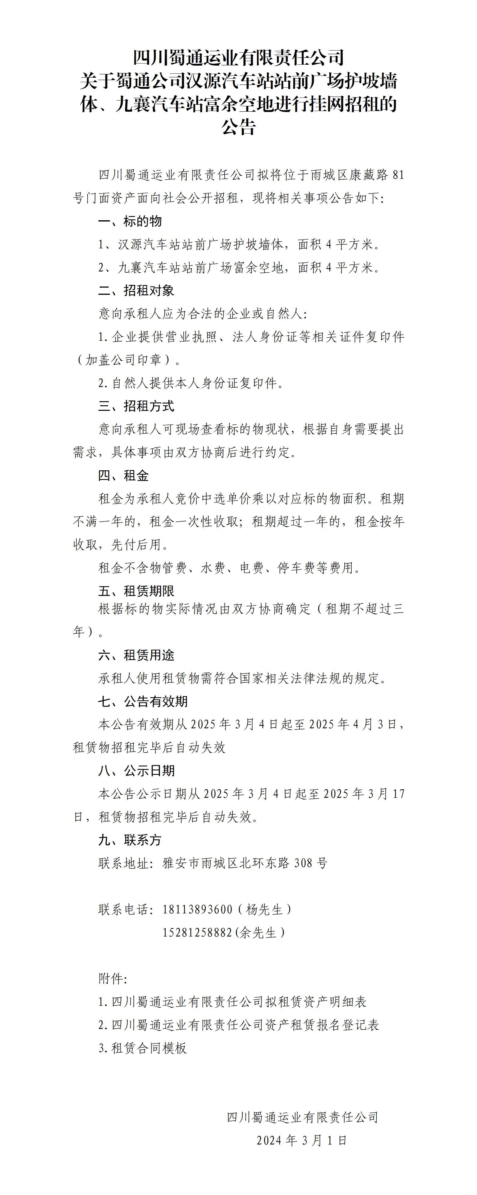 四川蜀通運業(yè)有限責任公司 關于蜀通公司漢源汽車站站前廣場護坡墻體、九襄汽車站富余空地進行掛網(wǎng)招租的公告