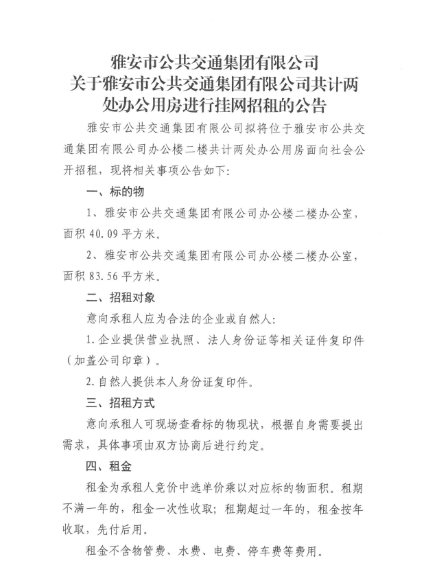 關(guān)于雅安市公共交通集團(tuán)有限公司共計兩處辦公用房進(jìn)行掛網(wǎng)招租的公告