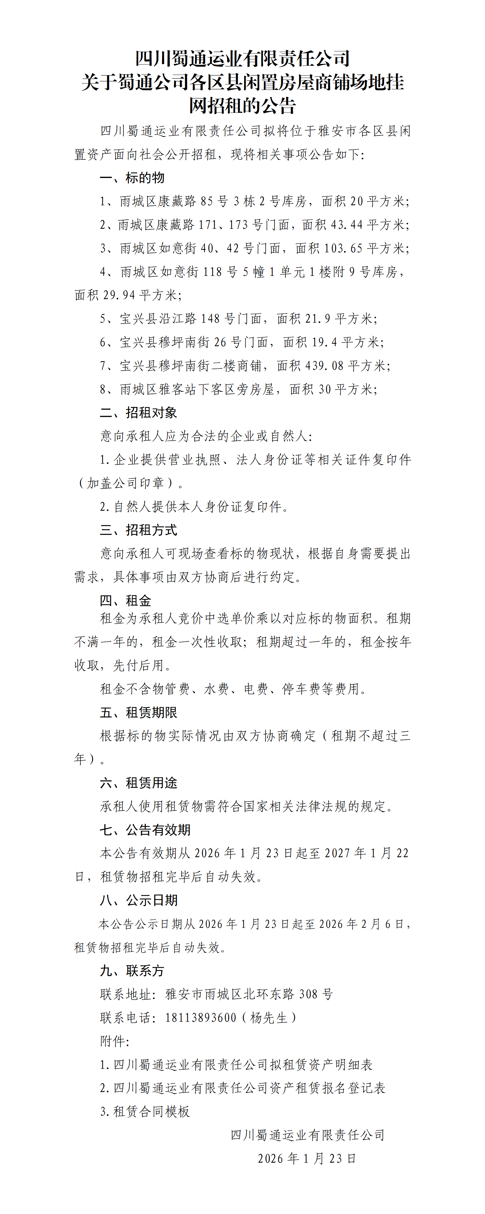 四川蜀通運業(yè)有限責任公司關于蜀通公司各區(qū)縣閑置房屋商鋪場地掛網招租的公告