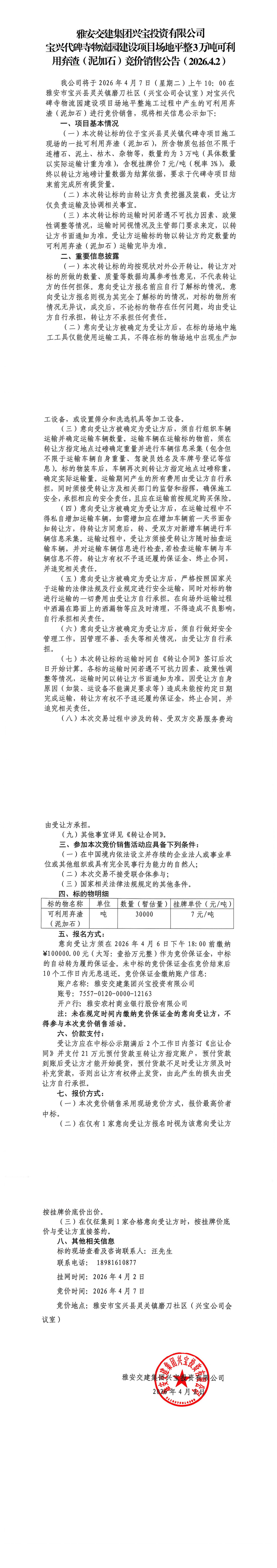雅安交建集團(tuán)興寶投資有限公司 寶興代碑寺物流園建設(shè)項(xiàng)目場(chǎng)地平整3萬噸可利用棄渣(泥加石)競(jìng)價(jià)銷售公告