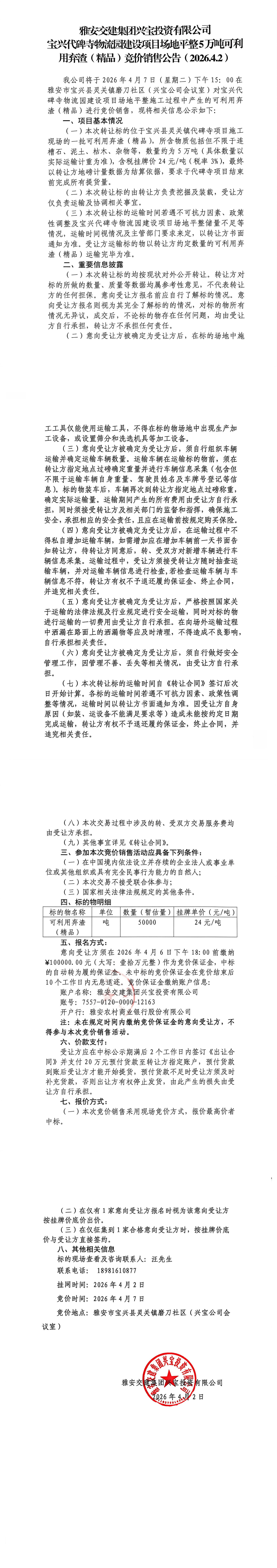 雅安交建集團興寶投資有限公司 寶興代碑寺物流園建設(shè)項目場地平整5萬噸可利用棄渣(精品)競價銷售公告