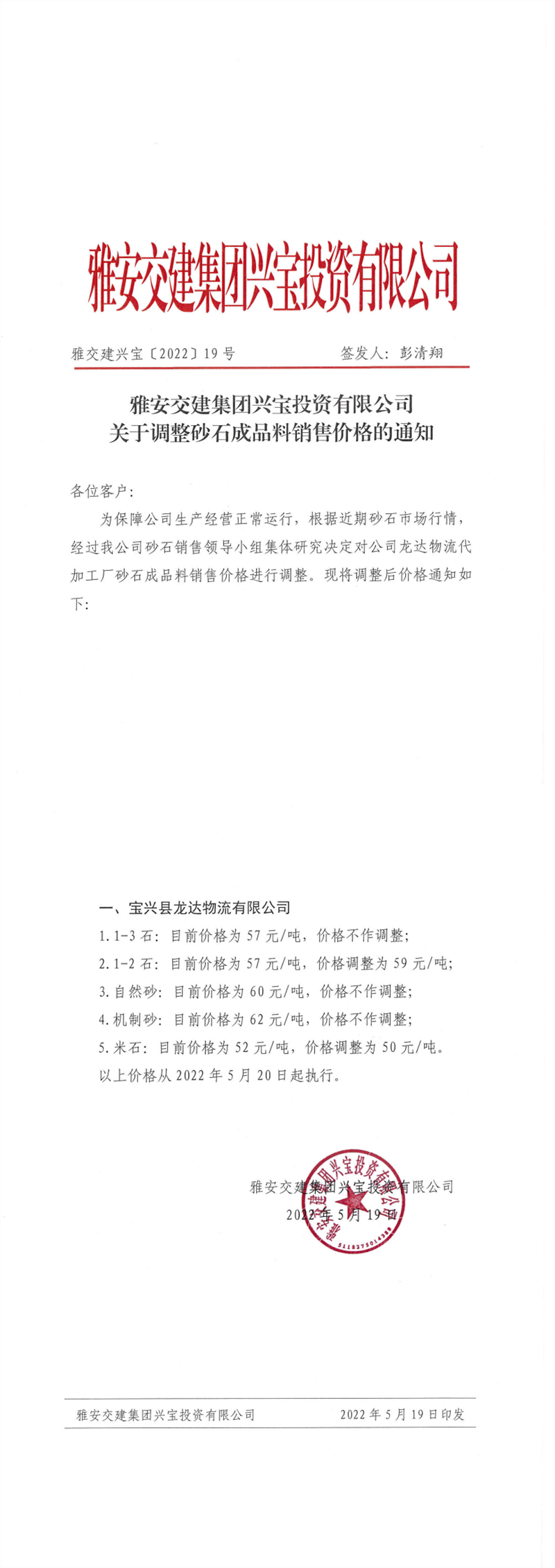 雅安交建集團(tuán)興寶公司關(guān)于調(diào)整砂石成品料銷(xiāo)售價(jià)格的通知-2022-5-19