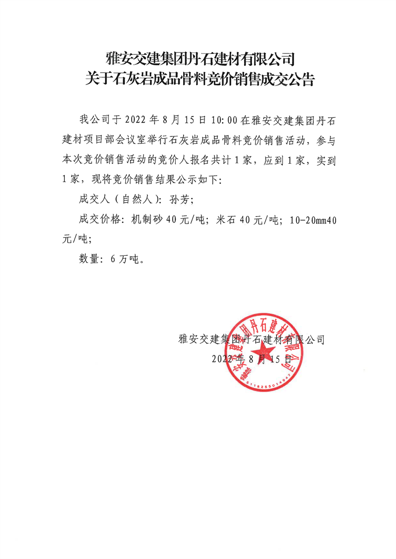 雅安交建集團(tuán)丹石建材有限公司關(guān)于石灰?guī)r成品骨料競價銷售成交公告