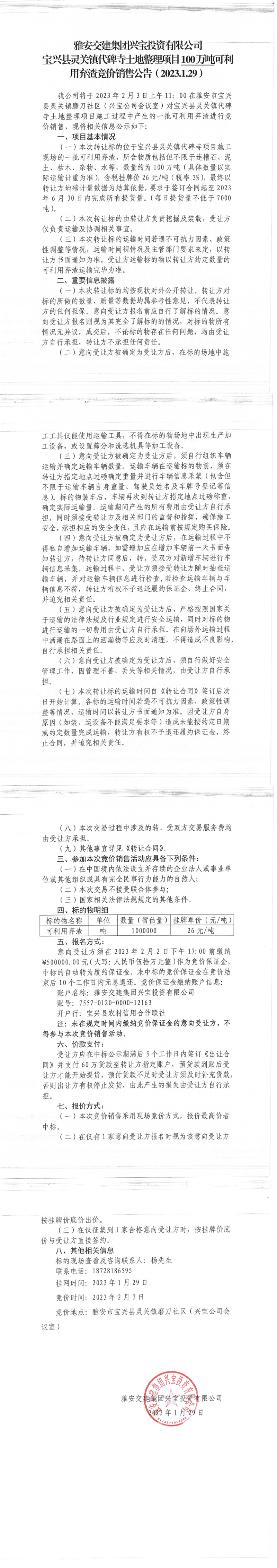 雅安交建集團(tuán)興寶投資有限公司靈關(guān)鎮(zhèn)代碑寺土地整理項(xiàng)目100萬噸可利用棄渣競價(jià)銷售公告(2023.1.29)