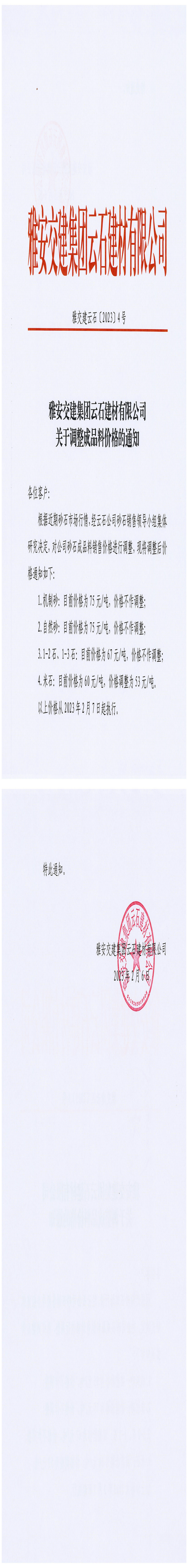 雅安交建集團(tuán)云石建材有限公司關(guān)于調(diào)整成品料價(jià)格的通知-2023-02-06