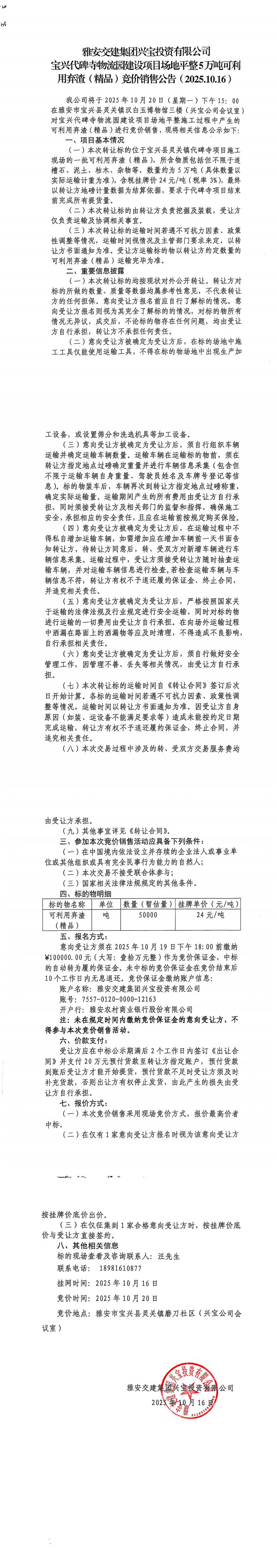 雅安交建集團(tuán)興寶投資有限公司寶興代碑寺物流園建設(shè)項(xiàng)目場地平整5萬噸可利用棄渣(精品)競價銷售公告(2025.10.16)