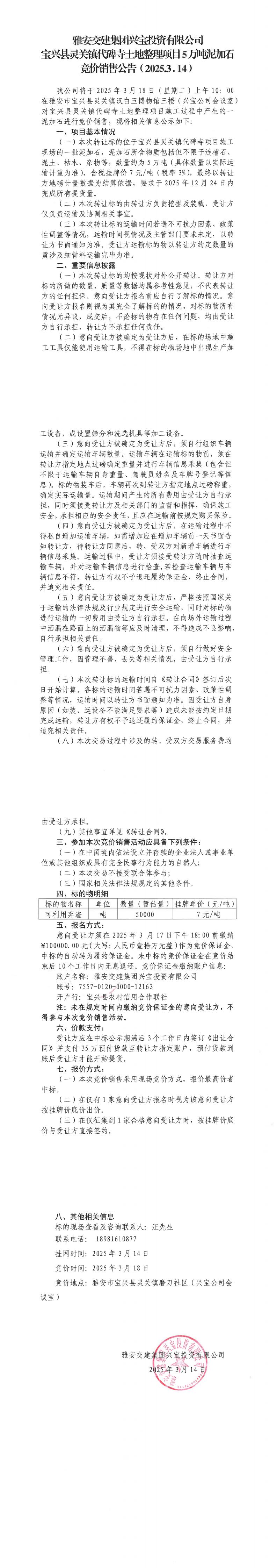 雅安交建集團興寶投資有限公司寶興縣靈關鎮(zhèn)代碑寺土地整理項目5萬噸泥加石競價銷售公告(2025.03.14)